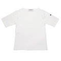 すっきりしたボートネックに、半袖はふつうよりやや長め。袖まわりがきれいに見えます。