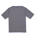 すっきりしたボートネックに、半袖はふつうよりやや長め。袖まわりがきれいに見えます。
