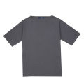 すっきりしたボートネックに、半袖はふつうよりやや長め。袖まわりがきれいに見えます。